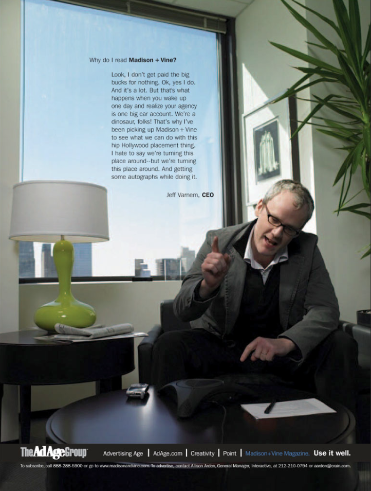 Look, I don't get paid the big bucks for nothing. Ok, yes I do. And it's a lot. But that's what happens when you wake up one day and realize your agency is one big car account. We're a dinosaur, folks! That's why I've been picking up Madison + Vine to see what we can do with this hip Hollywood placement thing. I hate to say we're turning this place around - but we're turning this place around. And getting some autographs while doing it.